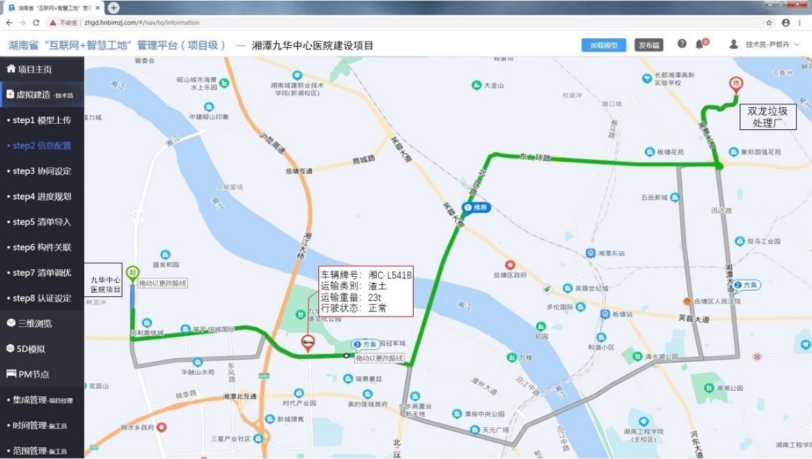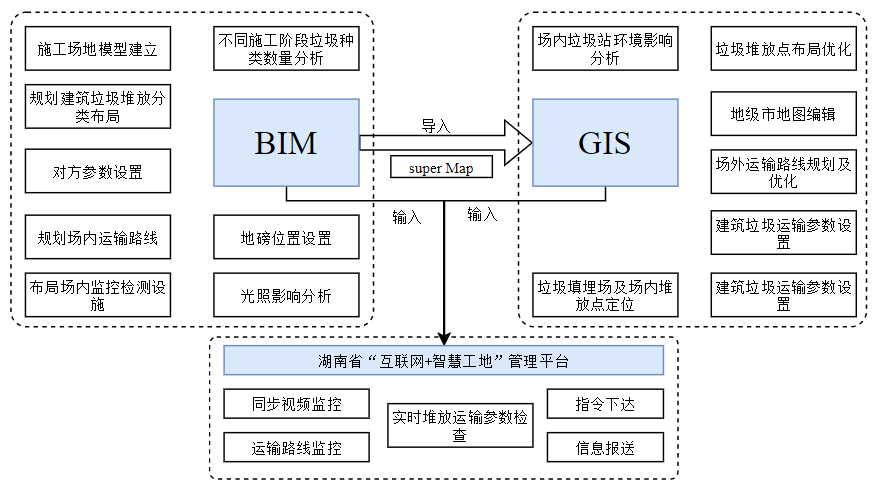 BIM與GIS技術(shù)的融合,應(yīng)用BIM的微觀建模與GIS宏觀地圖的相互交換以及互相操作,擴寬了BIM的應(yīng)用級別,從單體延伸到建筑群甚至城市級或者全國全球性的超大型模型建設(shè),也使GIS行業(yè)的應(yīng)用發(fā)展提供了一個新的方向。本次研究通過BIM對整個項目進(jìn)行現(xiàn)場建模,然后結(jié)合GIS系統(tǒng)將項目模型建立在市級地圖上,通過GIS模型對垃圾的各種場景進(jìn)行研究分析,尋找最優(yōu)的管理措施;基于湖南省“互聯(lián)網(wǎng)+智慧工地”管理平臺建立建筑垃圾處理協(xié)同管理平臺,實行各參與方共同協(xié)調(diào)管理。
