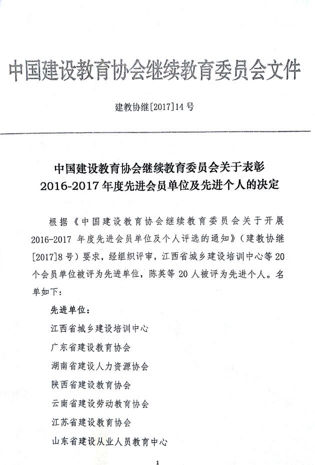 日前,從中國建設教育協(xié)會繼續(xù)教育委員會《關于表彰2016-2017年度先進會員單位及先進個人的決定》(建教協(xié)繼〔2017〕14號)獲悉,我會被評為2016-2017年度先進會員單位,陳英同志被評為先進個人。