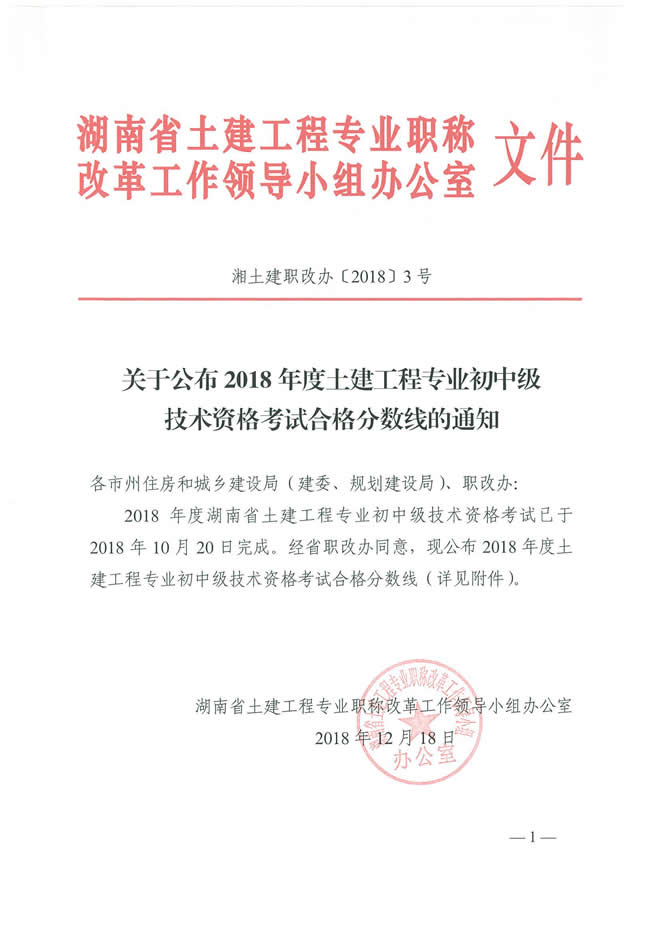 關于公布2018年度土建工程專業(yè)初中級技術資格考試合格分數線的通知