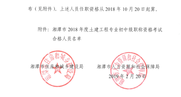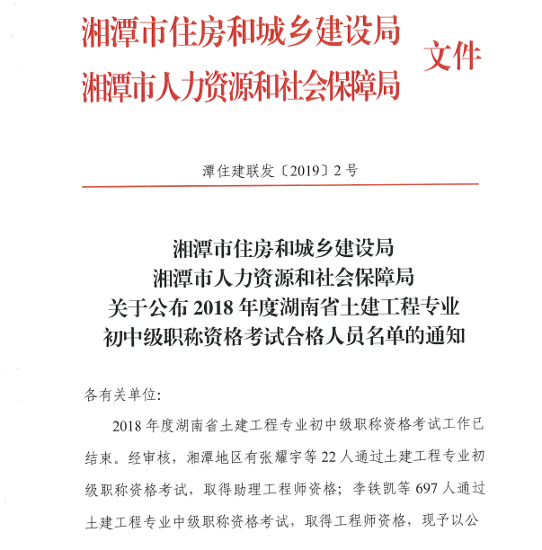 關(guān)于公布2018年度湘潭市土建工程專業(yè)初中級(jí)職稱資格考試合格人員名單的通知